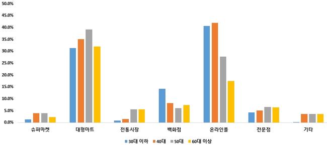 농식품 구매처는 여전히 대형마트가 우세했다. 신선식품 구매 시 대형마트(46.2%)와 전통시장(18.2%)이 주요 채널로 나타났으며, 선물용 가공식품은 온라인 구매 비중(33.2%)이 높았다. 대형마트는 상품 다양성과 접근성이, 전통시장은 가격 경쟁력이, 온라인몰은 배송 편의성이 장점으로 꼽혔다.
