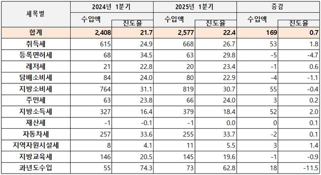 2025년 1분기 지방세 수입이 25조 8천억 원으로 집계되며, 전년 동기 대비 1조 7천억 원 증가한 것으로 나타났다.