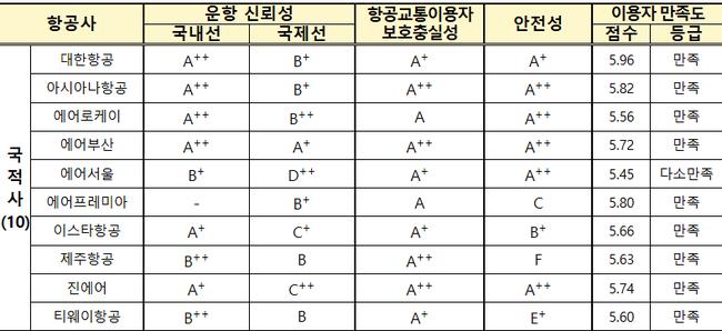 이 중 에어부산은 A+를 받았으나, 인천공항 중심의 저비용항공사들은 연결 지연 등의 이유로 낮은 등급을 받았다. 에어서울은 D++, 진에어와 이스타항공도 C등급대를 기록해 상대적으로 부진했다. 외항사 중에서는 전일본공수, 카타르항공이 A++를 받은 반면, 루프트한자(E++), 에어프랑스(D+) 등 유럽 항공사는 낮은 성적을 기록했다.