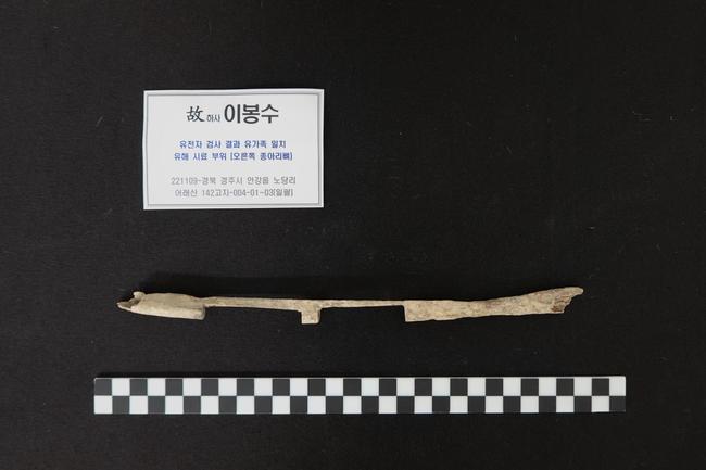 2022년 11월 경상북도 경주시 안강읍 노당리 어래산 일대에서 발굴 및 수습된 고 이봉수 하사의 유해(우측 종아리뼈)