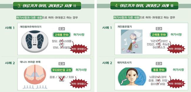 과거 적발 사례로는 ‘이온수를 마시면 암과 아토피가 치료된다’는 허위 주장이나, ‘근육통 완화’ 목적으로 허가된 저주파자극기를 혈당·콜레스테롤·비만 치료용으로 오인하게 하는 사례가 있다. 최근 5년간 점검 실적은 연 평균 1,100여 건에 이르며, 올해 상반기에도 839건이 점검됐다.