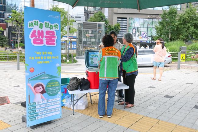 이번 `서리풀원두막 샘물` 사업은 야외 무더위쉼터로 지정된 곳에서 서초구 자율방재단과의 협업을 통해 진행되는 서초형 폭염 사업으로 `그늘, 생수, 사람`의 세 가지 요소를 결합해 폭염 속 보행자들에게 오아시스와 같은 휴식과 시원함을 선사하며 온열질환 예방에도 크게 기여할 것으로 전망된다.