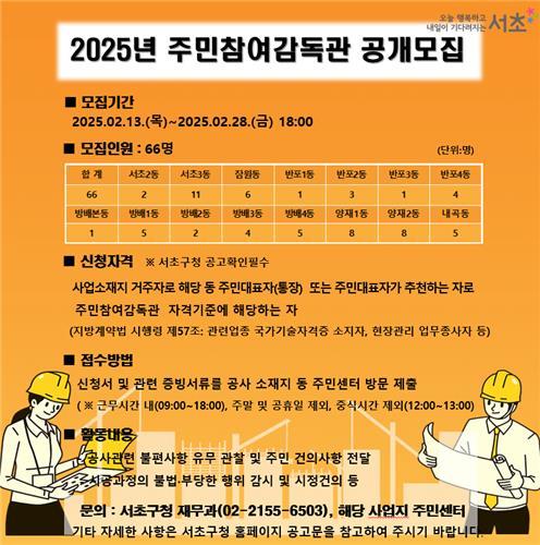서울 서초구(구청장 전성수)가 오는 28일까지 지역 내 생활밀착형 공사에 `2025년 주민참여감독관`으로 참여할 주민 66명을 공개 모집한다고 밝혔다.
