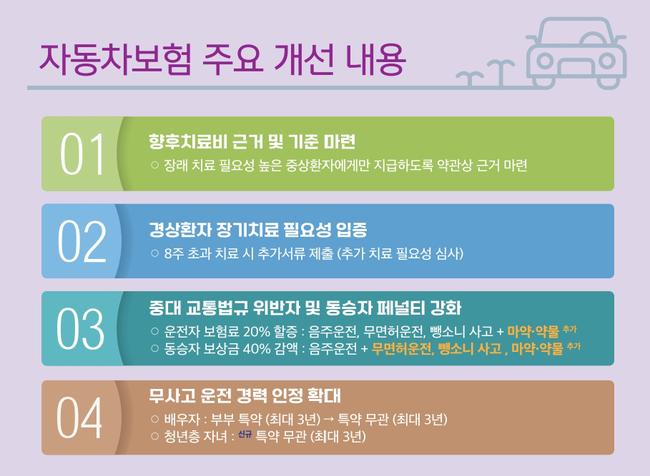 또한, 마약·약물 운전에 대한 보험료 할증(20%)을 도입하고, 무면허·뺑소니 운전자 동승자의 보상금도 40% 감액하도록 변경한다. 배우자·자녀의 무사고 경력도 확대 인정해, 기존에는 ‘부부한정특약’ 가입자만 인정됐으나 앞으로는 모든 배우자가 최대 3년간 무사고 경력을 인정받을 수 있도록 했다.