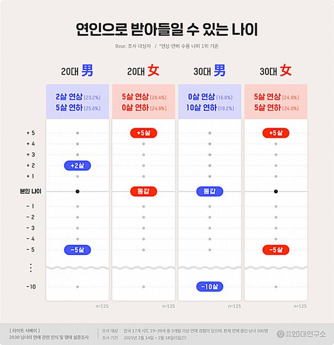 연하의 경우 20대 남성은 5살 연하(25.6%)가 1위였고, 20대 여성은 연하가 아닌 동갑(24.7%)을 꼽은 응답이 가장 많았다. 30대 남성은 10살 연하(19.2%)가 1위로 나타나 연인으로 받아들이는 연하의 나이 폭이 가장 넓었으며, 30대 여성은 5살 연하(24.0%)까지 연인으로 수용하는 비율이 가장 높았다.