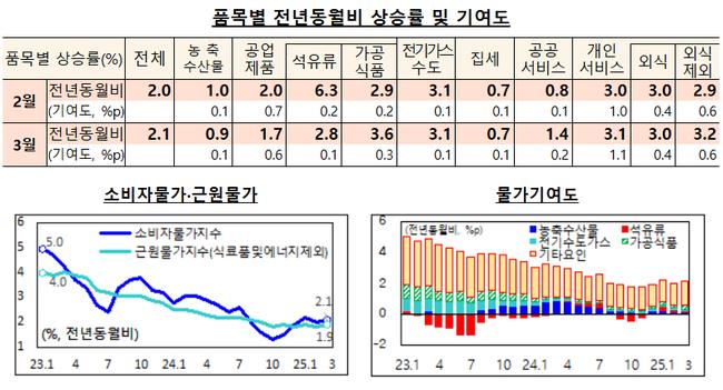 2025년 3월 소비자물가가 전년 동월 대비 2.1% 상승해 전월보다 상승폭이 소폭 확대됐으며, 정부는 먹거리 수급 관리와 산불 피해 대응 등을 통해 물가 안정에 총력을 다하겠다고 2일 밝혔다.